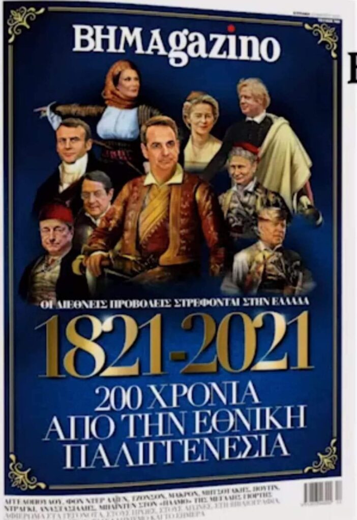 To περιοδικό κατάφερε να παρουσιάσει ένα κιτς εξώφυλλο, αυτό που βλέπετε στη φωτογραφία. Εμφανίζονται ο Κυριάκος Μητσοτάκης ως Ιωάννης Μακρυγιάννης, ο Βλαντίμιρ Πούτιν ως Νικηταράς, ο Εμμανουέλ Μακρόν ως Ιωάννης Καποδίστριας, ο Μπόρις Τζόνσον ως Λόρδος Μπάιρον, η Ούρσουλα φον ντερ Λάιεν ως Μαντώ Μαυρογένους, ο Μάριο Ντράγκι ως Ανδρέας Μιαούλης και ο Τζο Μπάιντεν ως Θεόδωρος Κολοκοτρώνης. Μέχρι και ο Κύπριος πρόεδρος Νίκος Αναστασιάδης υπάρχει στο εξώφυλλο.